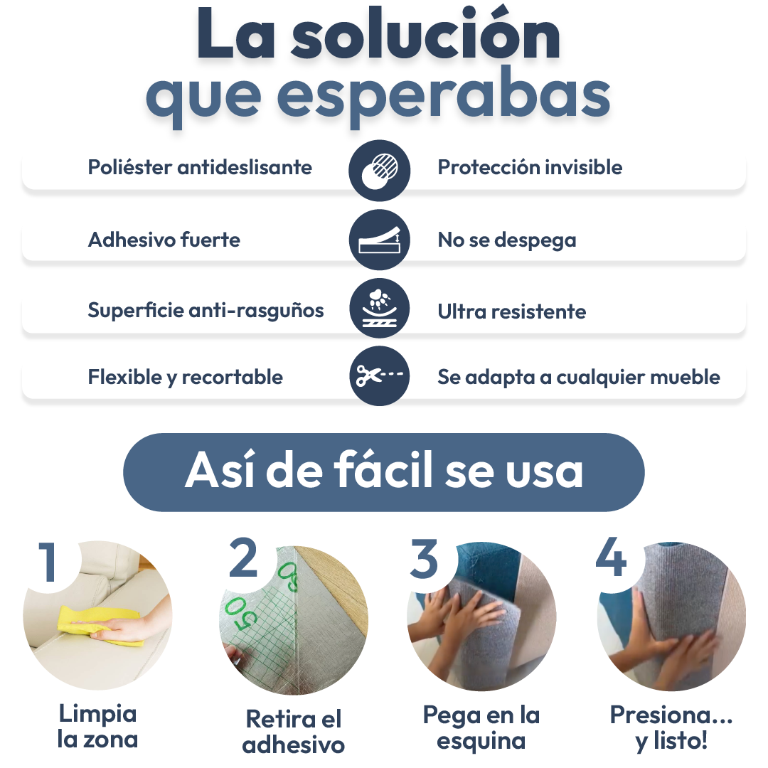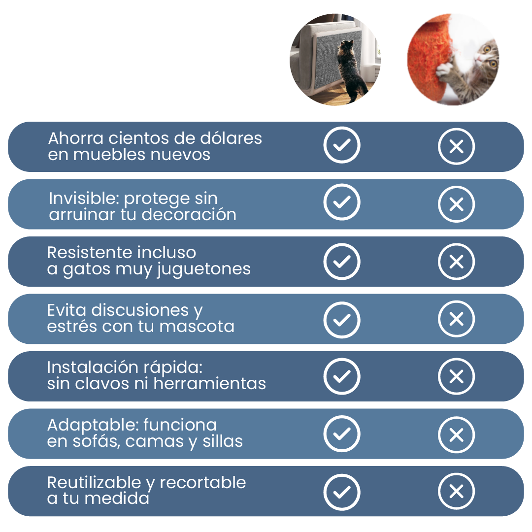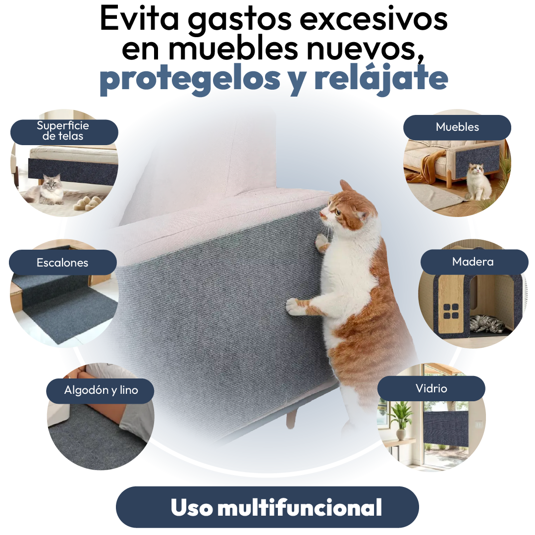 El rascador protector está hecho con materiales ultra resistentes al desgaste. Su adhesivo fuerte se adhiere firmemente sin dañar sofá, Funciona porque redirecciona el instinto natural de rascar, ofreciendo una superficie segura mientras tus muebles permanecen intactos.