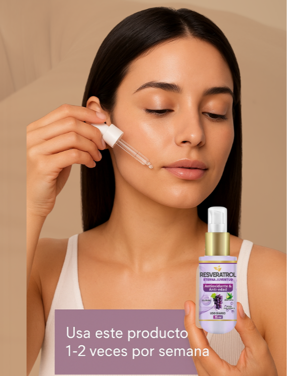 2. Aplica 2-3 gotas del serum resveratrol en tu rostro 🌿